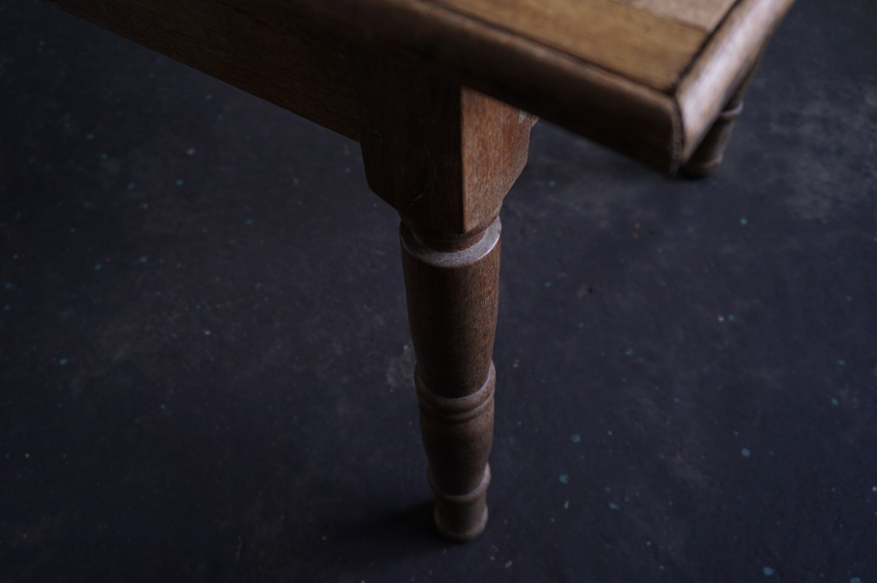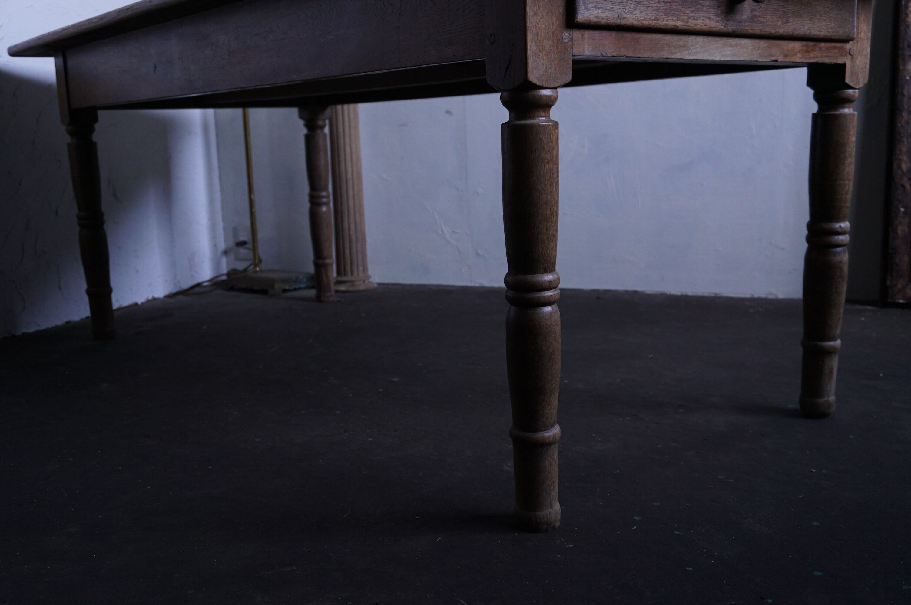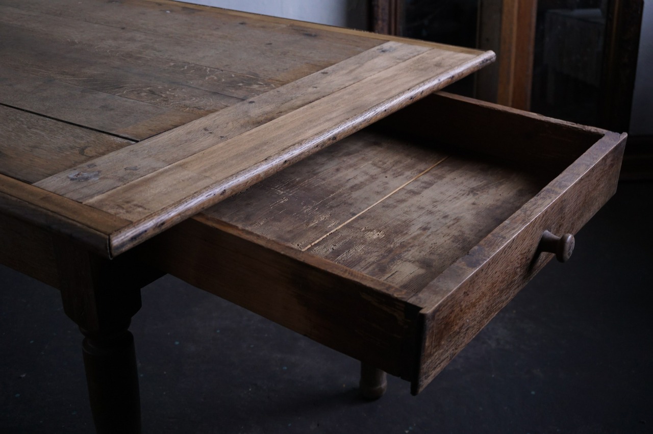 古いものですので、多少のシミやキズ等は見られますが、それもまたアンティークの良さだと思います。またご希望がございましたら、質感が変わらないナチュラルなワックスを天板に掛けてからお渡しいたしますので、お気軽にお申し付け下さいませ。