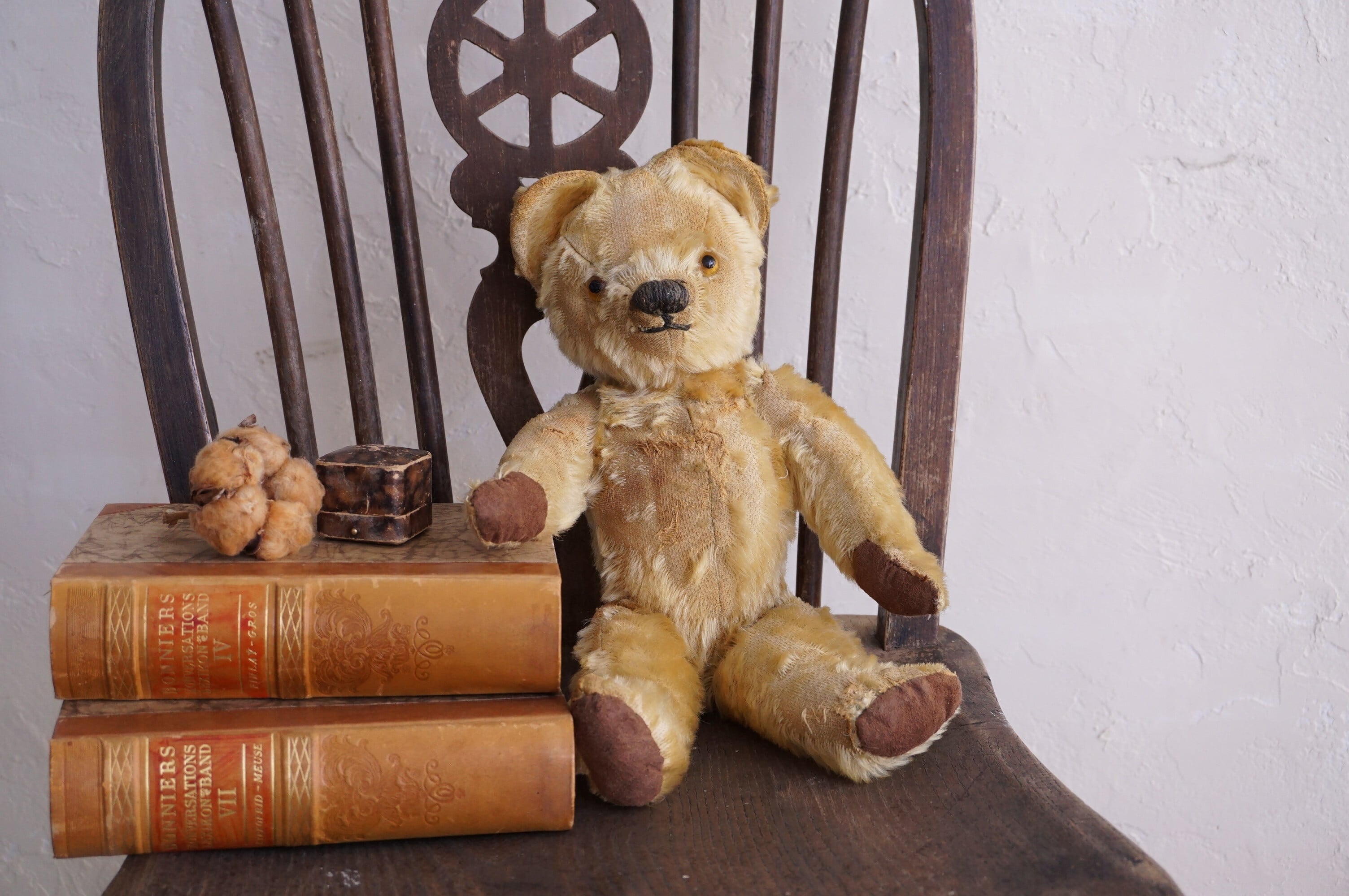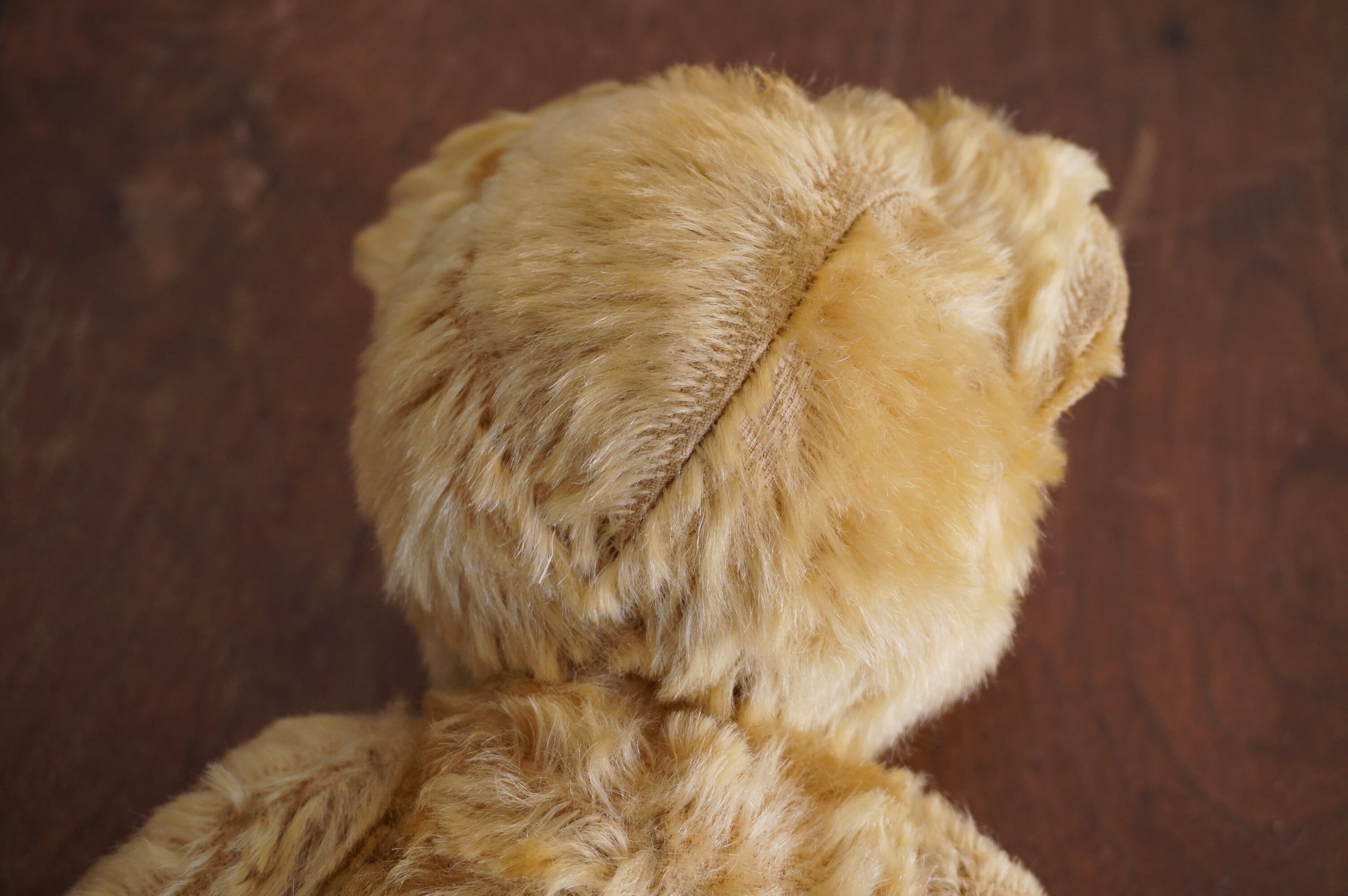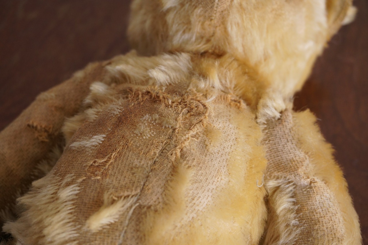 手前にご紹介しておりますテディベアと、恐らくにはなりますが、同じくイングランドで1930年に創業された、ぬいぐるみメーカーの名高い老舗Merrythought(メリーソート)のテディベアになるかと思います。