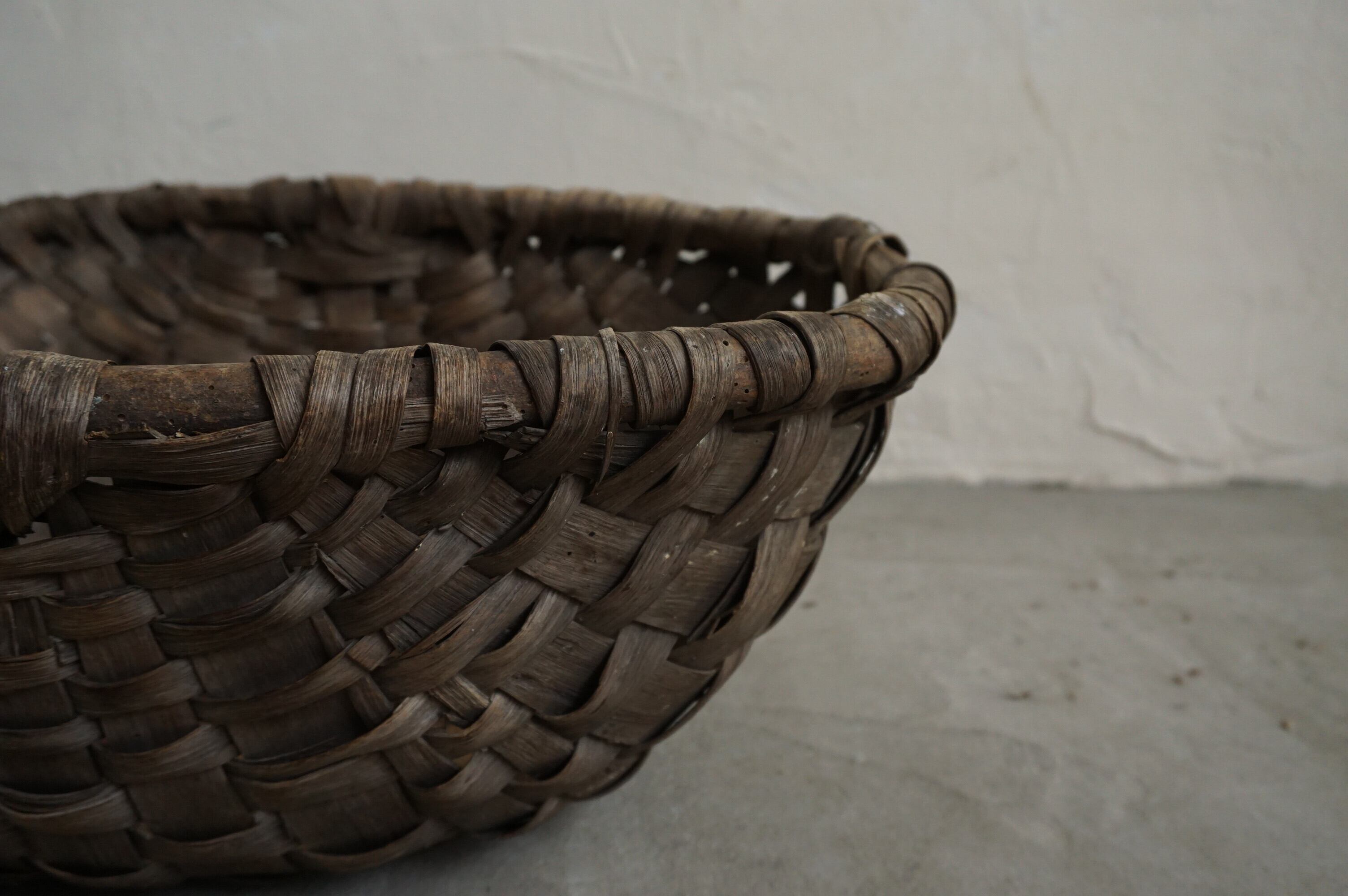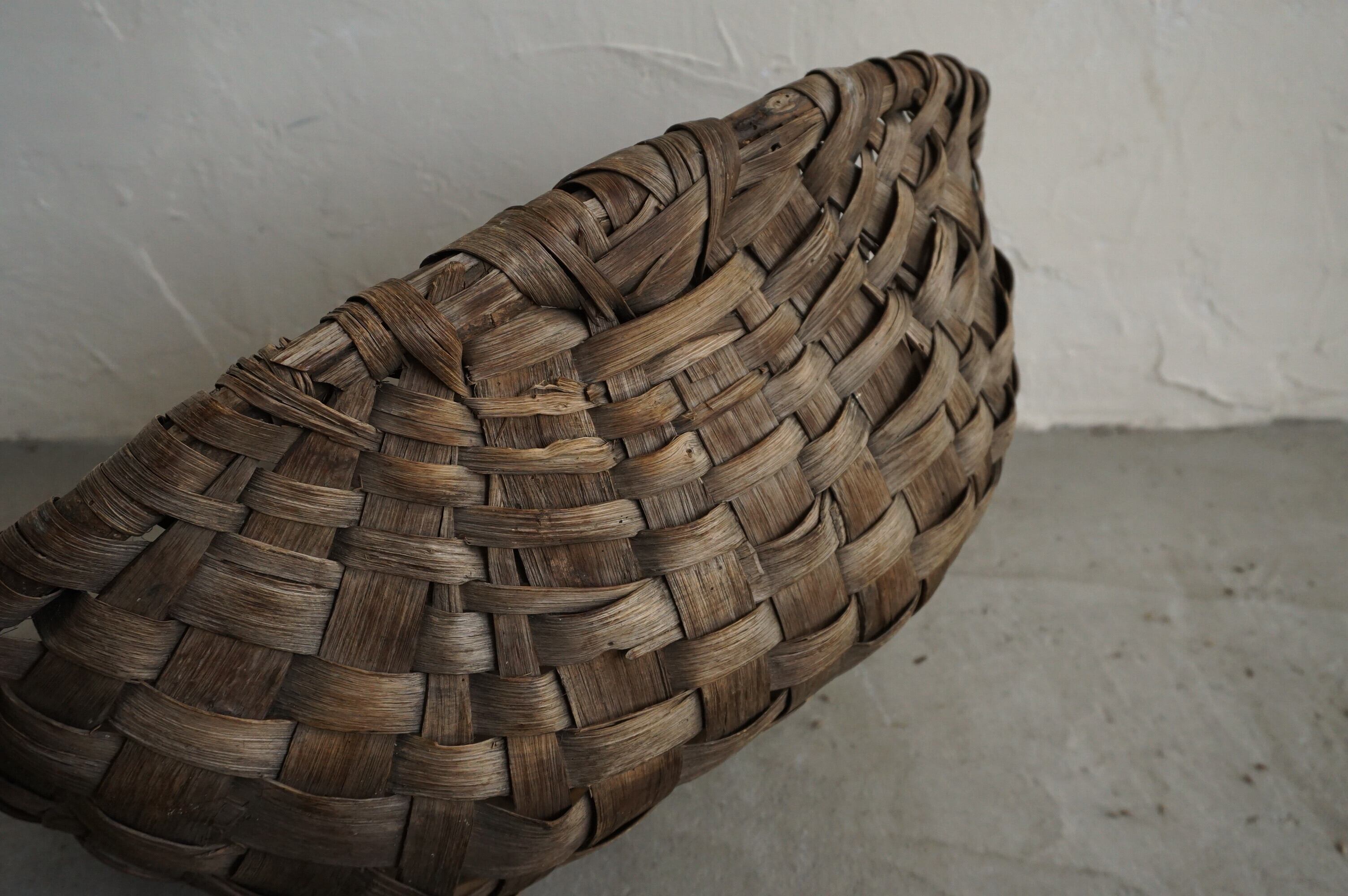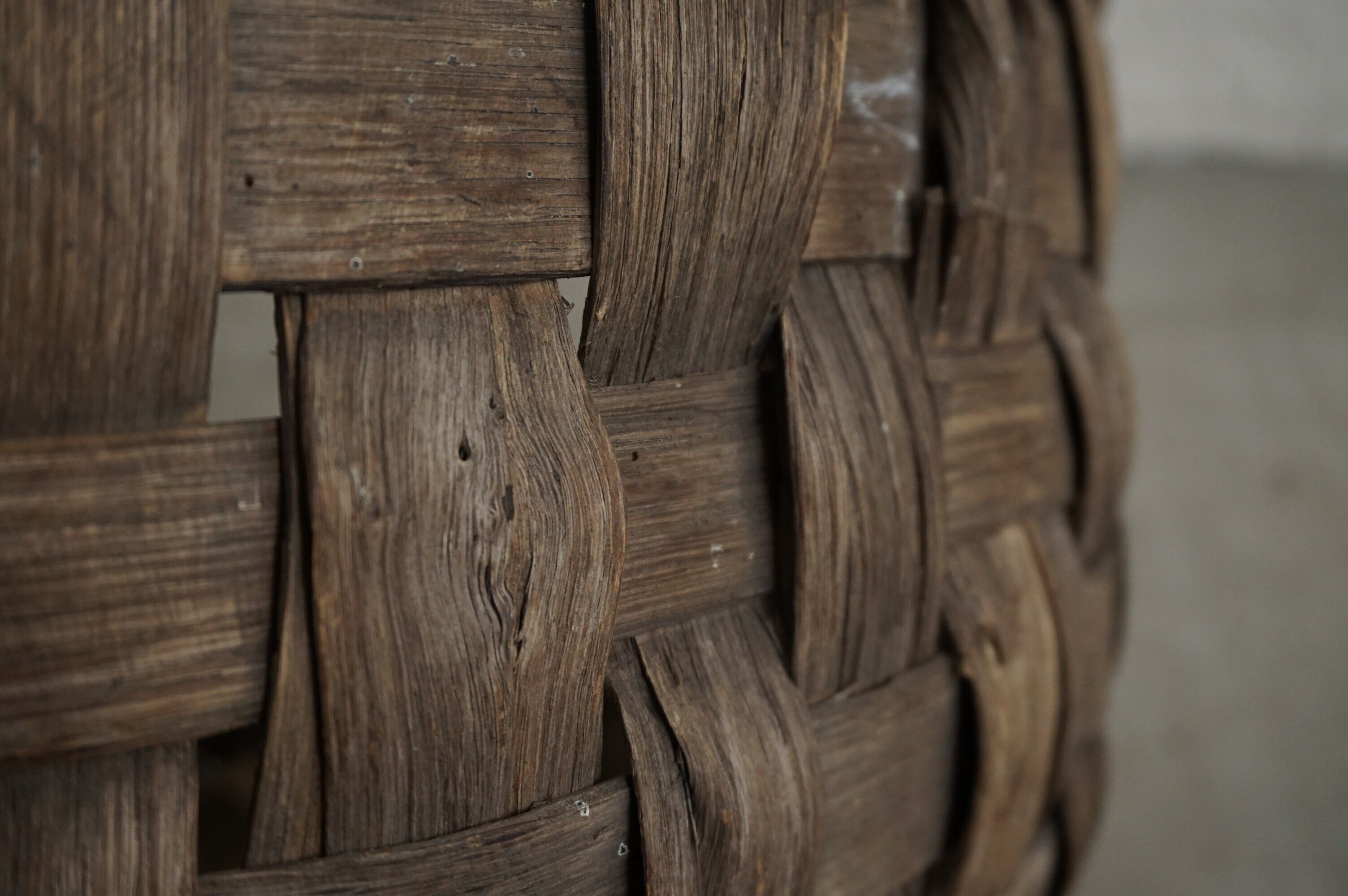 薄くはいだ木を編み込んで作られた、珍しいもので、近くで見ると古い木の素材感が感じられるバスケットです。