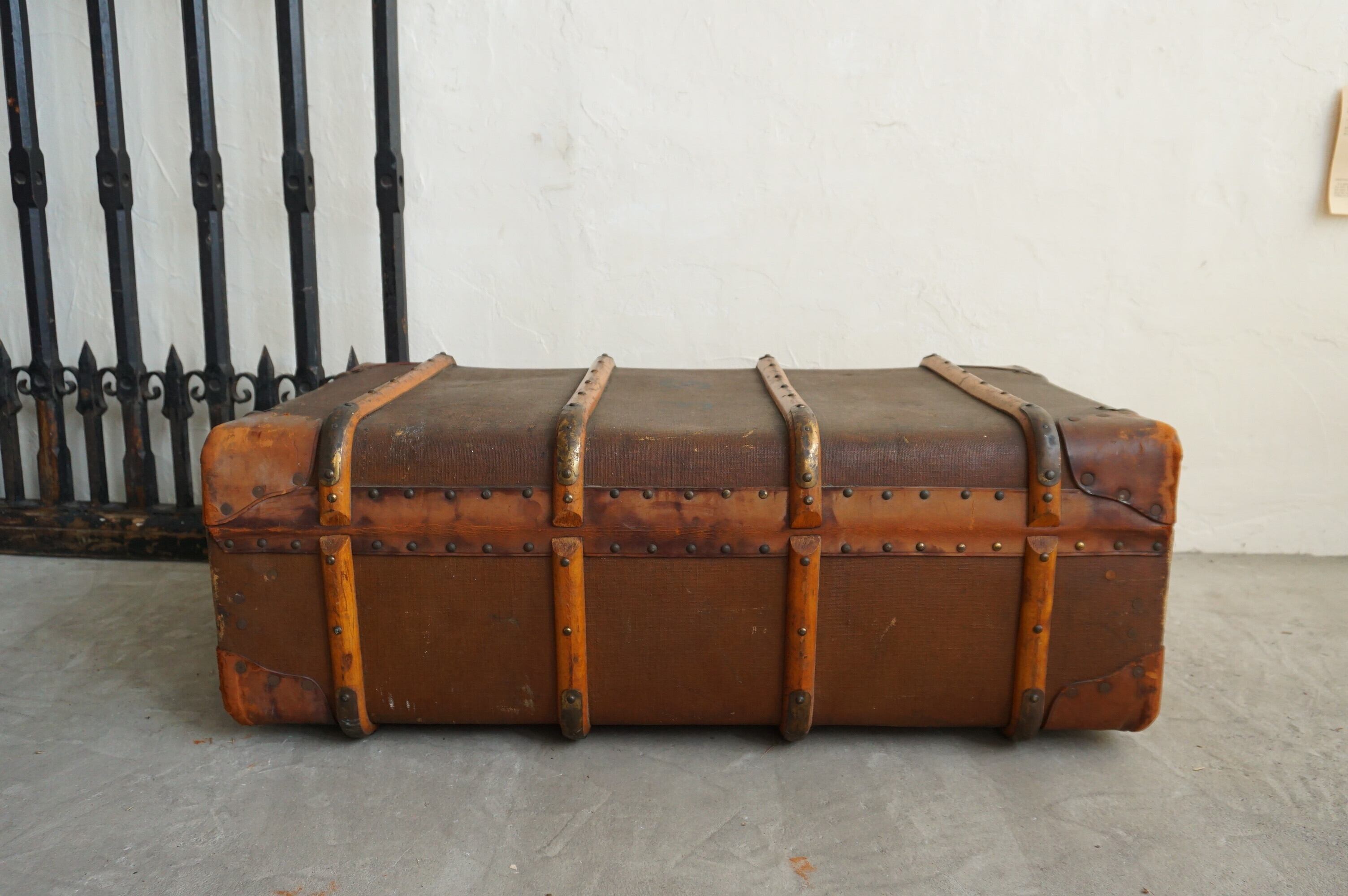 トランクを保護するように、木の枠があてがわれ、そのうえで一番外側の地面接触する部分には金属の真鍮でカバーされております。