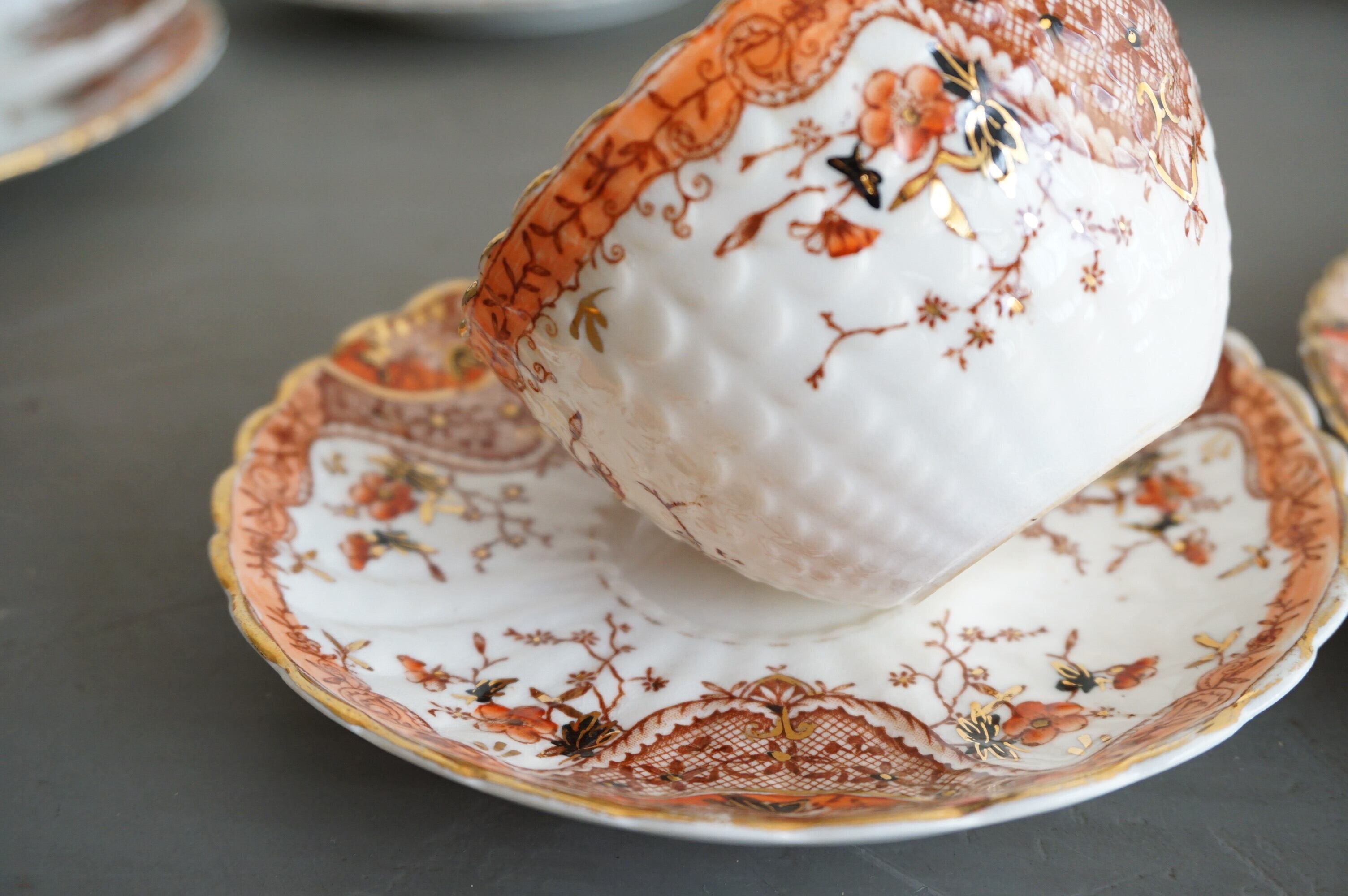 こちらのティーカップセットもボーンチャイナで出来ており、薄く光に当てると透ける様な透光性のある焼き物に、よく見るとカップやお皿表面も品のいいウロコ様な凹凸があり、高い技術で丁寧に造形と絵付けされているのが分かります。
